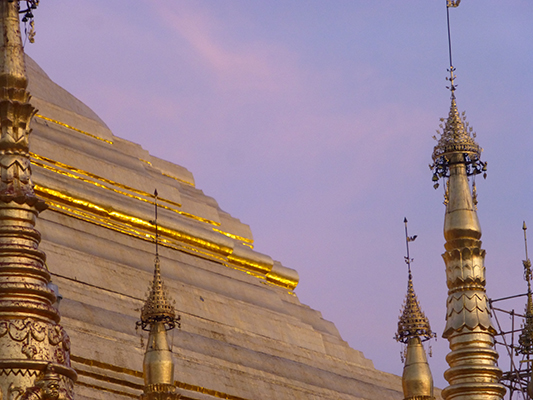 I think the the Shwedagon Pagoda is covered in inches of gold leaf.