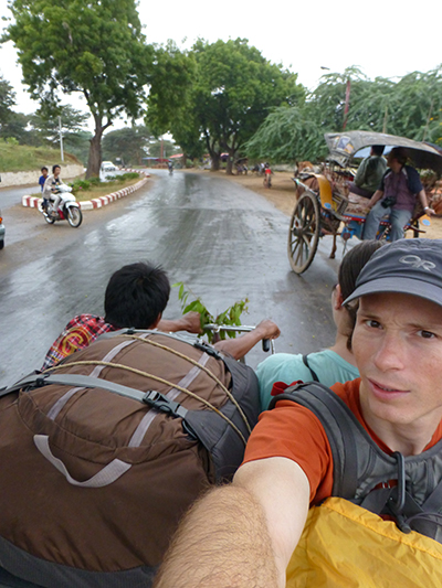 This trishaw ride cost us 1000 Kyat ($1.20). We planned to walk to our second hotel in Bagan but that was such a good price. The horse drawn carriage you see in the background wanted to charge us 6000 Kyat ($7.15).