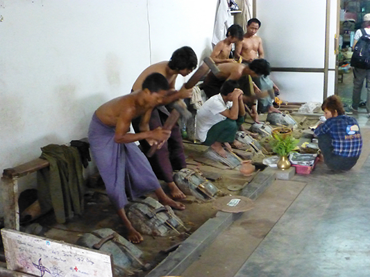 These guys pound gold nuggets until they flat thin sheets. The gold leaf is used heavily in Buddhist temples.