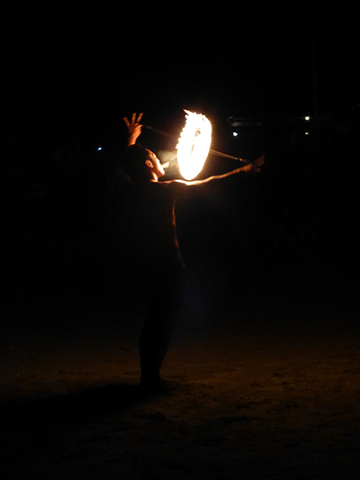 For the finale he lit a cigarette with the spinning inferno near his head.
