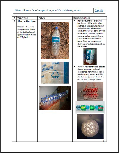 Dave and I decided that to understand the types of plastic wastes and suggest sorting we needed to understand all waste streams coming from the campus. We walked around and took pictures of all the different types of waste we saw and where it was on campus. We had one of the students walk us around the dorms as well. It was amazing the difference we saw between the boys dorm and the girls dorms. Overall we found a variety of different types of waste and suggested they have three different bins-compostable waste, plastic bottles, and waste to be burned or appropriately disposed of. We provided a report and they seemed to be excited with the results. I hope what we did was actually beneficial to them and can be used in the future.