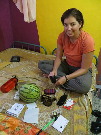 Sarah making pockets to hold the battery and extra SD card in our new camera case.