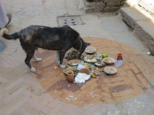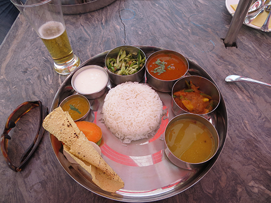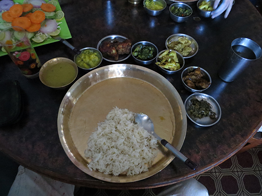 On this day we were invited to spend part of it celebrating with the family of a friend from back home, Lila. Lila’s brother, Bhuwan, who we’d met the day before, picked us up and brought us to his family’s home. We spent part of the day with his sisters, mother, father and some extended family. A couple of Bhuwan and Lila’s sisters prepared us the best Nepali meal we’ve ever had. It goes by many names, but I’ll refer to it as a Nepali Thali. It consists of rice and a variety of “side” dishes that you can mix with the rice or eat on their own. The most popular mixture is the dhal (lentils) and rice. Sometimes the meal includes meat. In this case we had some amazing baked chicken.